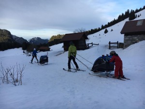 Le lendemain : c’était un peu le jour de vérité : première sortie avec charrette pour Auriane sur la longue descente et la neige verglacée … premier test : résultat EXTRA … elle avait les affaires et Clara ( un peu malade : grippe ? ) et moi : Julia et Olyvia ( l’état de la neige ne permettait pas de s’occuper correctement d’elles à ski … C’est Esteban qui a eu de la chance sans pour autant se lâcher complètement seul : il est resté derrière la charrette pour se tenir sur cette neige sur une partie de la descente.